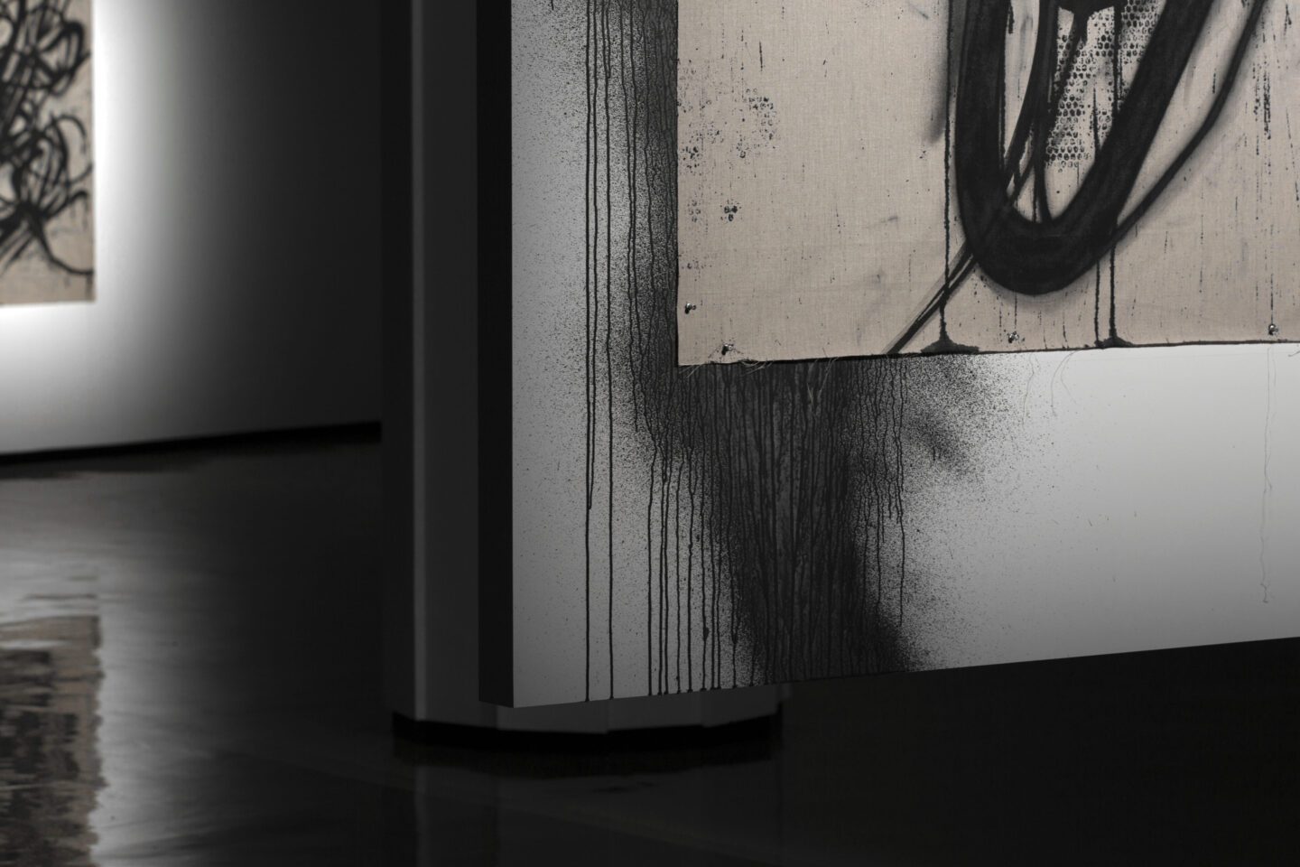 大きなスケールになると、黒は見る人を取り囲み、包み込むような存在になると思います。そうした環境では、暗い部屋にいるような感覚、あるいは暗闇に沈むような感覚に近づくのではないでしょうか。一方で、小さい面に黒い線が引かれるとき、空間へ拡張する力を感じると思います。