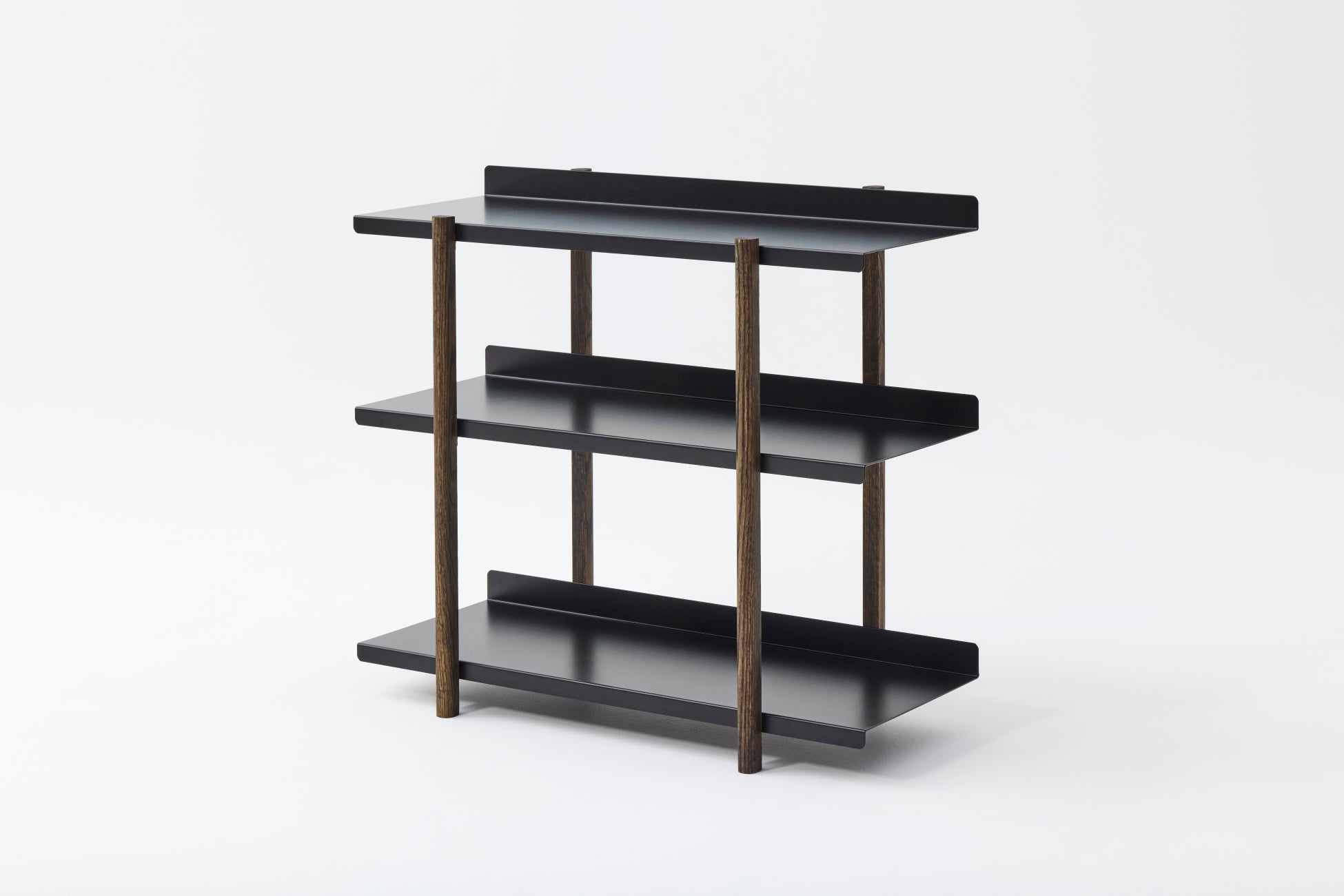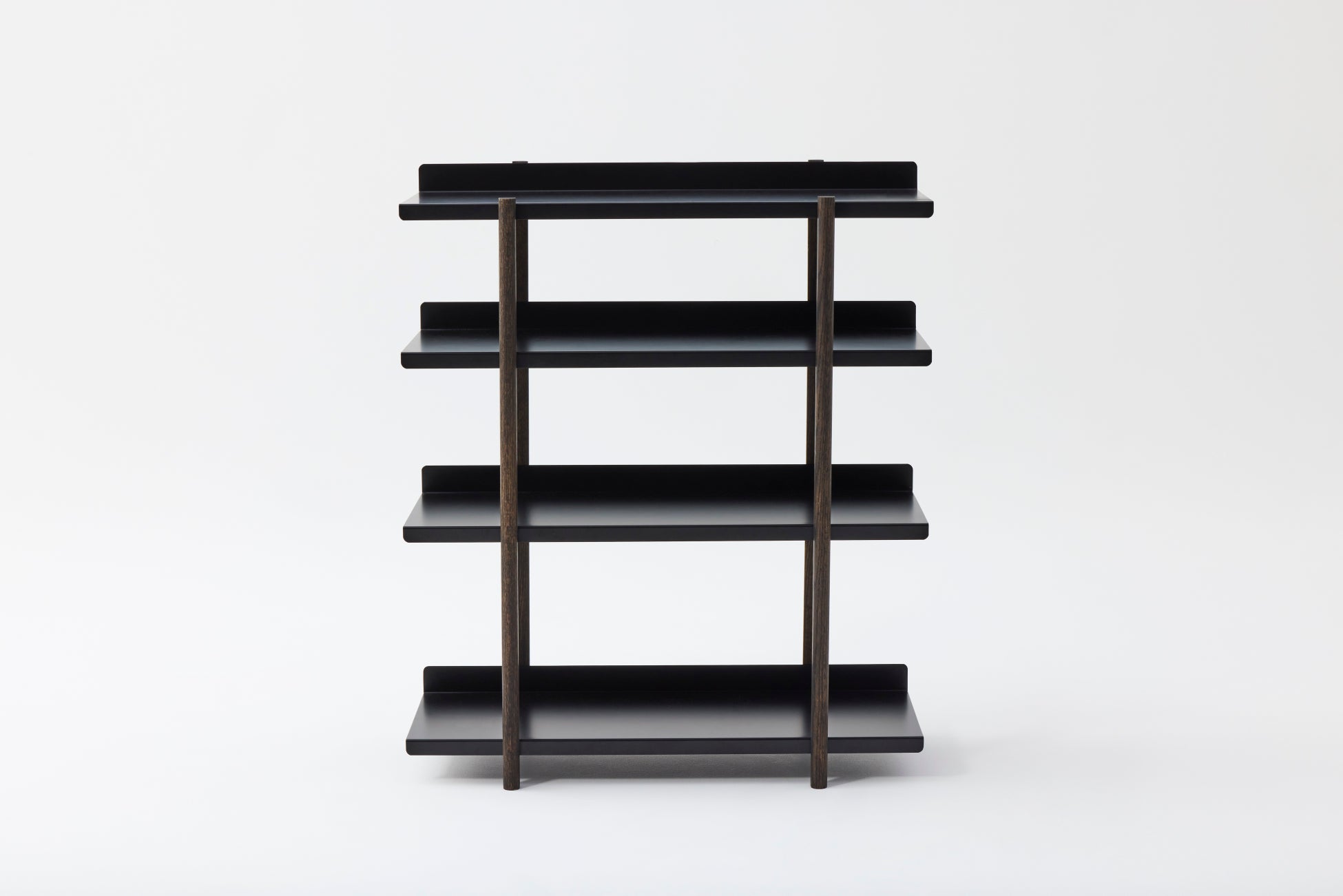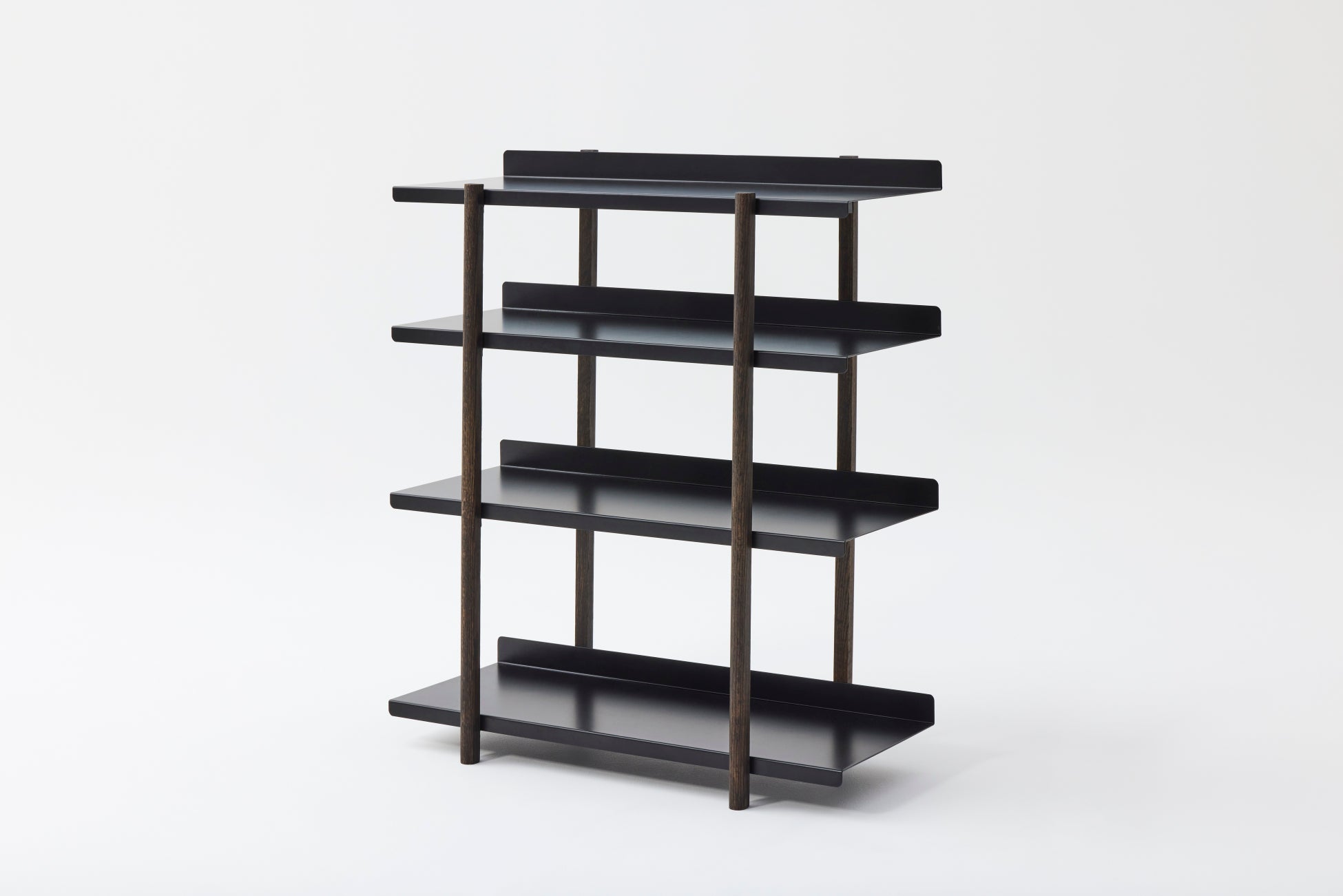 DUENDEの加工技術が叶える薄くて丈夫なスチール製の棚板はマットな質感に、オーク材の支柱はドイツのOSMOオイルで仕上げることにより、天然の木目が美しく引き出され、棚板との質感のバランスが良く、インテリアにも心地よく馴染み、背面にはクロスバーがないため間仕切りにも、また3段と4段を並べた高低差で空間にニュアンスを出すのもおすすめ。