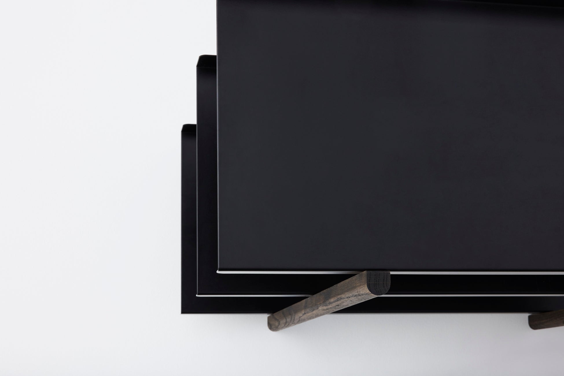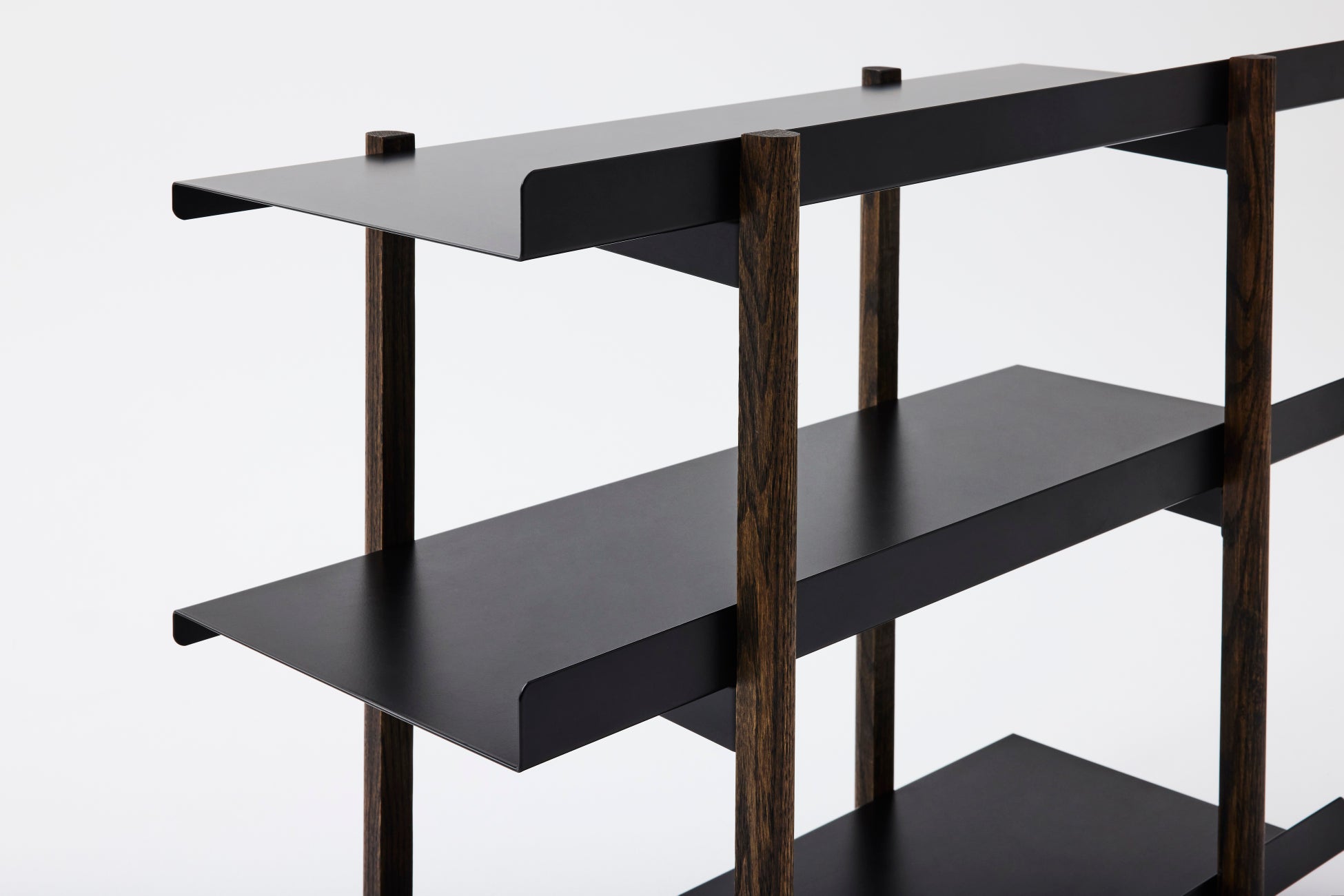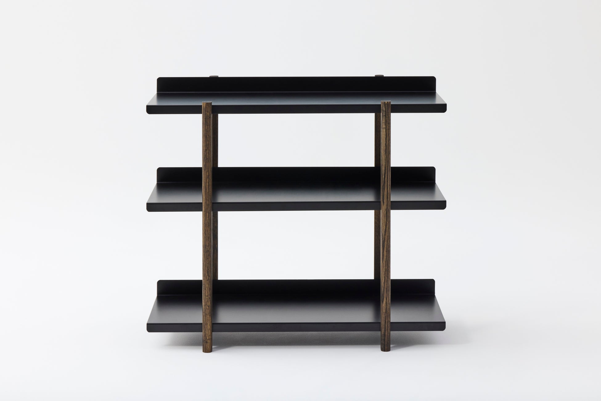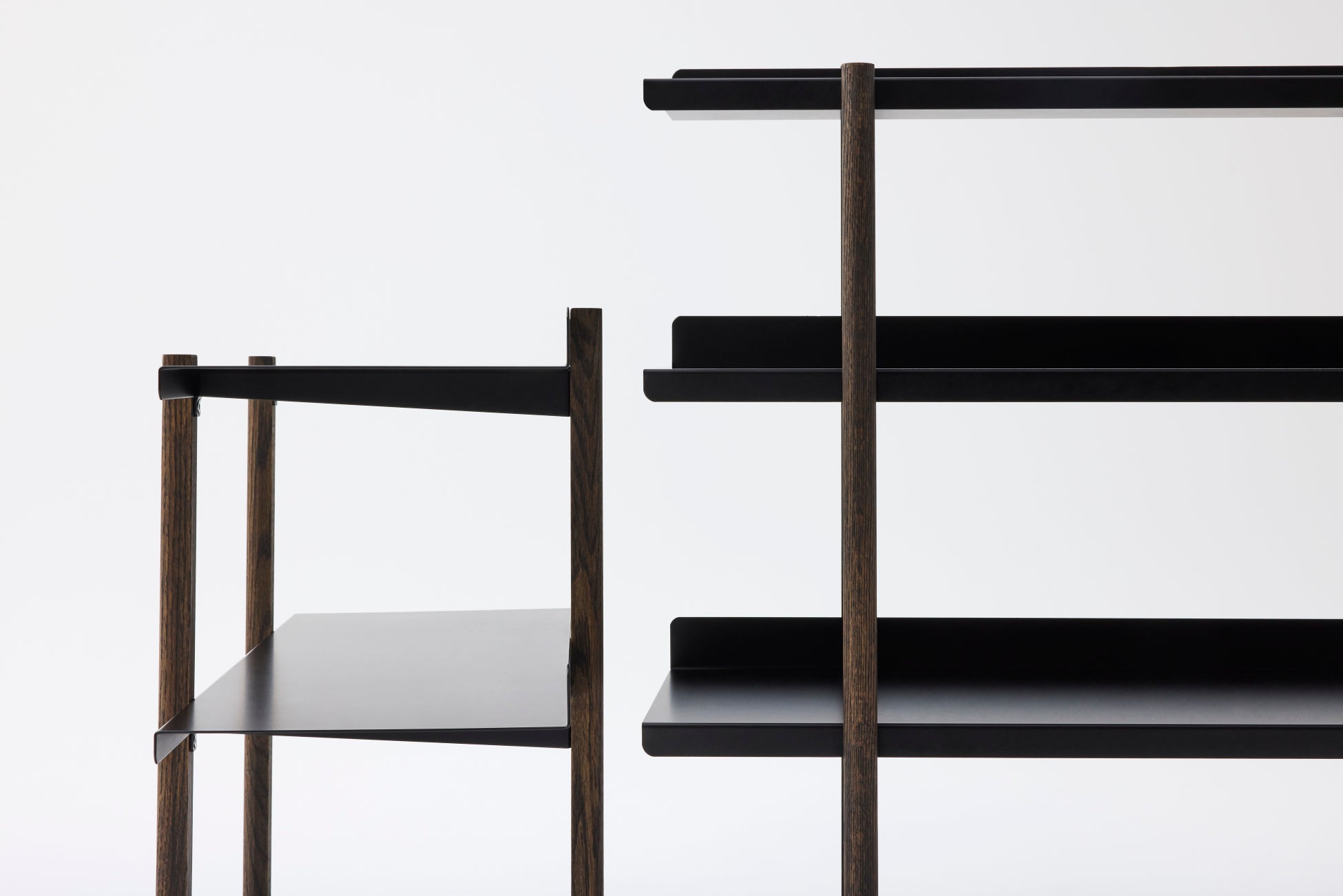 DUENDEの加工技術が叶える薄くて丈夫なスチール製の棚板はマットな質感に、オーク材の支柱はドイツのOSMOオイルで仕上げることにより、天然の木目が美しく引き出され、棚板との質感のバランスが良く、インテリアにも心地よく馴染み、背面にはクロスバーがないため間仕切りにも、また3段と4段を並べた高低差で空間にニュアンスを出すのもおすすめ。