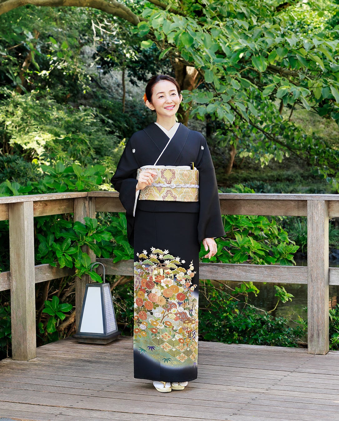 TAKAMI BRIDALが手がける「慶祥の彩り」は、既婚女性の第一礼装とされている黒留袖のオリジナルコレクション。新郎様新婦様のお母様やご親族にお召しいただける黒留袖には、おふたりへの寿ぎの想いと幸せへの祈りが込められている。伝統を受け継ぐ職人の手技にこだわり、刺繍や染めの多彩な技法を用いて、大切な方の慶びの席を凛と美しく、晴れやかに彩る。