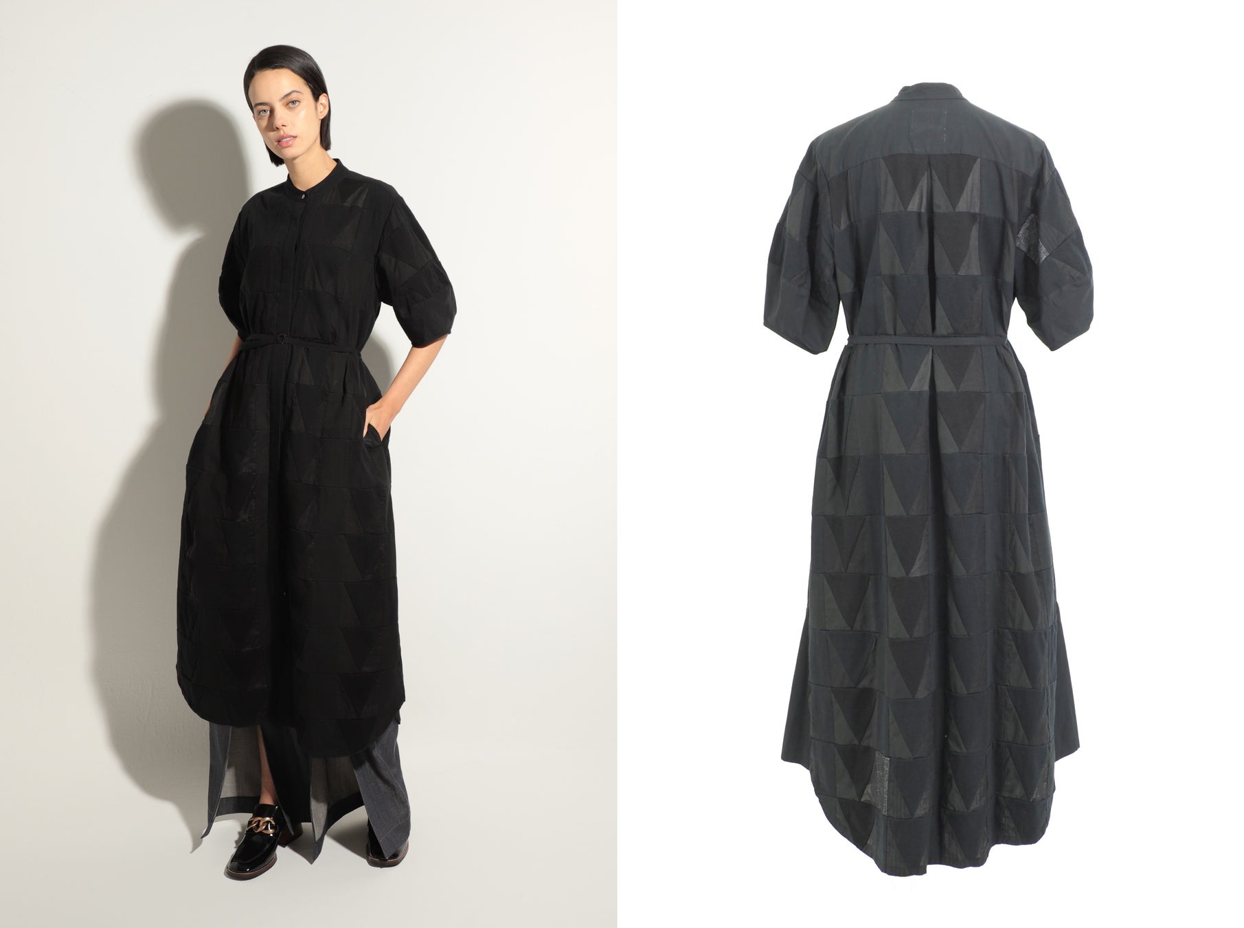 今回のポップアップでは、「ビーリリースト」が誇るリメイク力と丁寧な縫製に加え、「ミドラ」が得意とする建築的なプリーツワークやボタニカルなシルエットはもちろん、「Mlogo」のパッチワークを全体に生かしたバルーン袖のバンドカラーシャツドレスやハーフスリーブシャツなど、デザイン要素に加えた数々のコレクションを展開。