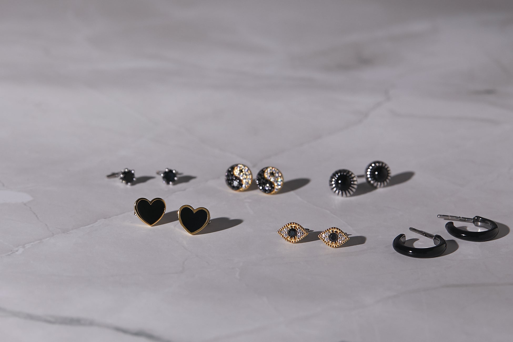 黒いハート型のピアスは、可愛らしいフォルムに、深みのあるブラックを掛け合わせることで、甘さとモード感が絶妙に両立している。