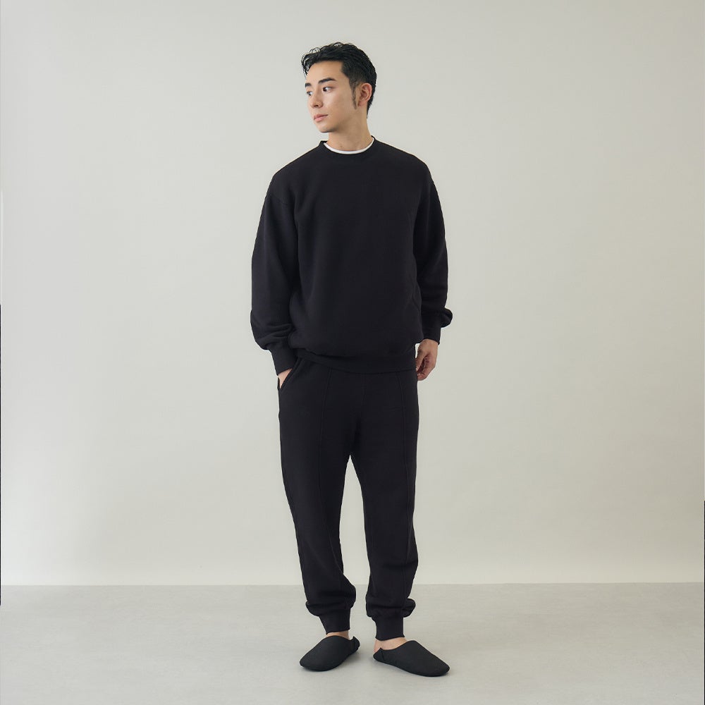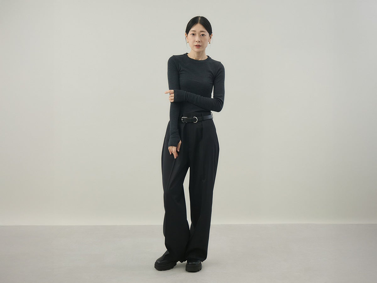 日常に使いやすい、kuros’オリジナルのウールカットソーやボトムスも。シルエットや縫製・黒色にこだわった上質な日本製のアイテムはトレンドに流されず長く愛用できるだろう。