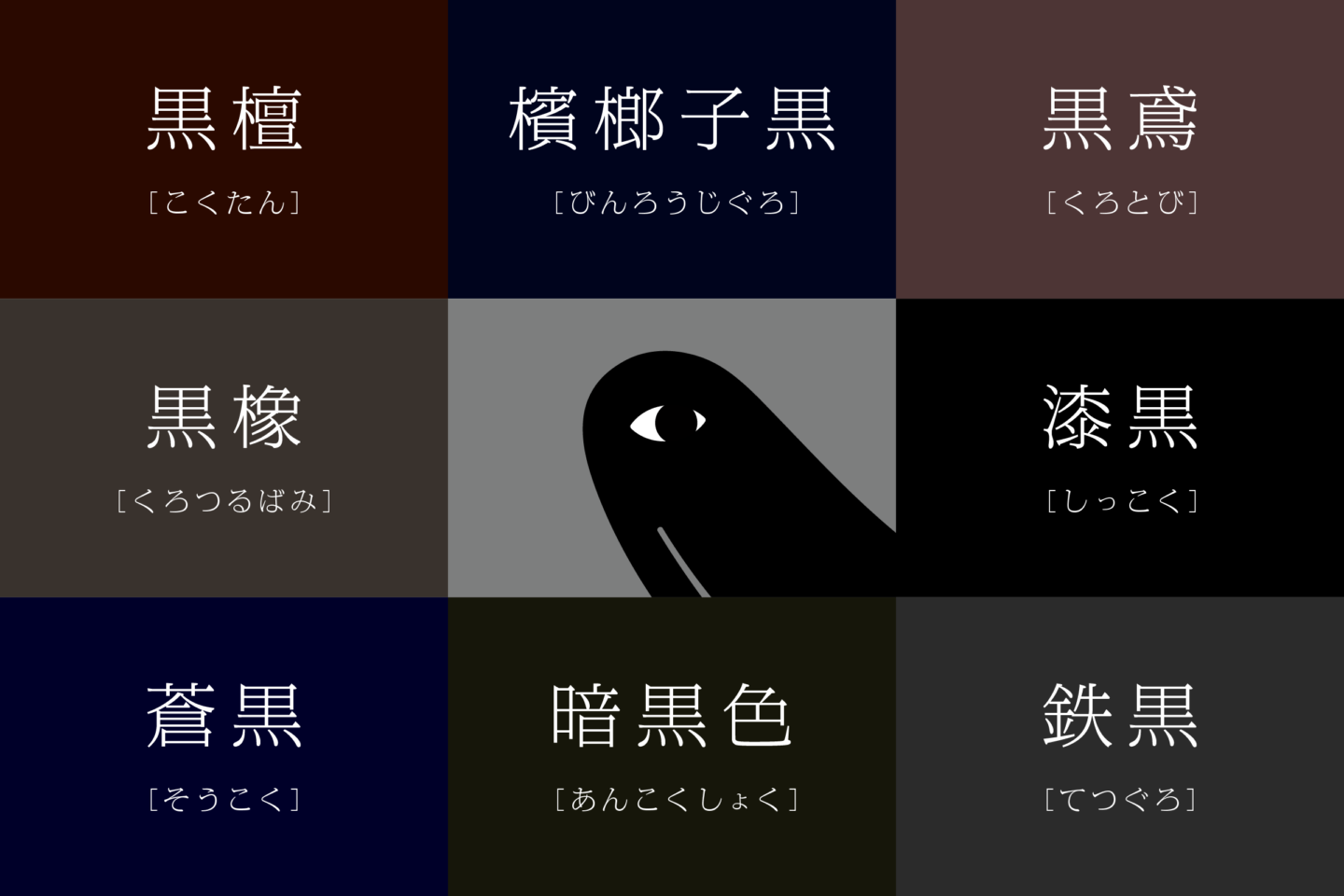 | 烏黒 | うこく | カラスの羽のように深く艶のある黒色。古くから美しい黒の代名詞とされた。 |