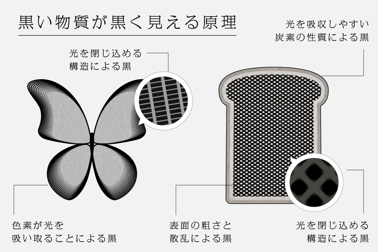私たちの身のまわりにある「黒」は、単一の原理ではなく、複数の物理・科学的現象が同時に作用することで生まれている。それぞれに、それぞれの「黒く見える原理」があるのだ。