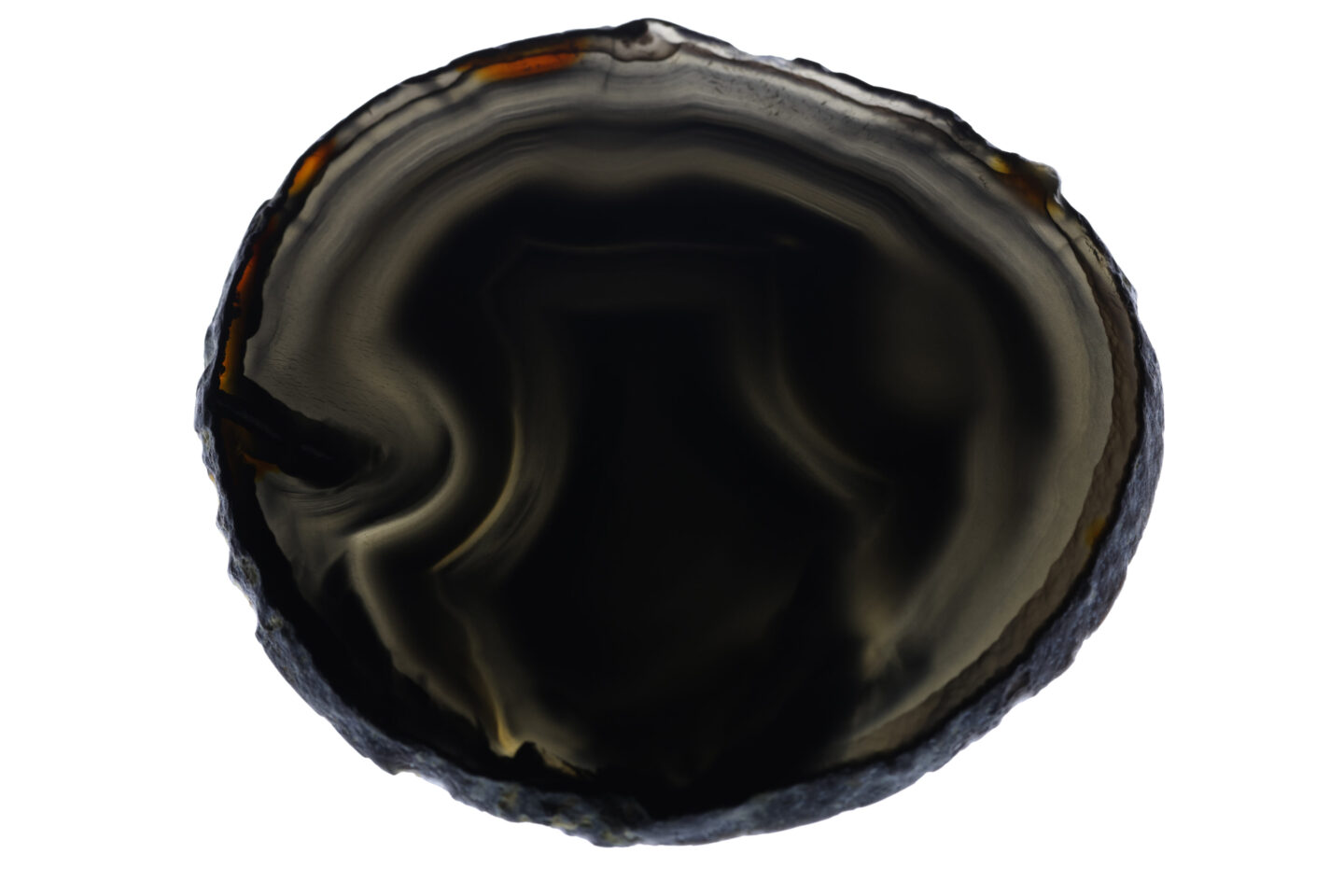 石橋さん:メノウ、英語ではアゲートと呼ばれる鉱物の一種です。縞模様が現れるものや、割ると内部に空洞があり、そこに小さな水晶が育っているタイプも見られます。硬度が高く、古代から護符や装身具として加工されてきました。「メノウ(瑪瑙)」という名前は、原石に見られるシワ模様が“馬の脳に似ている”という見立てから、中国で名づけられたものです。