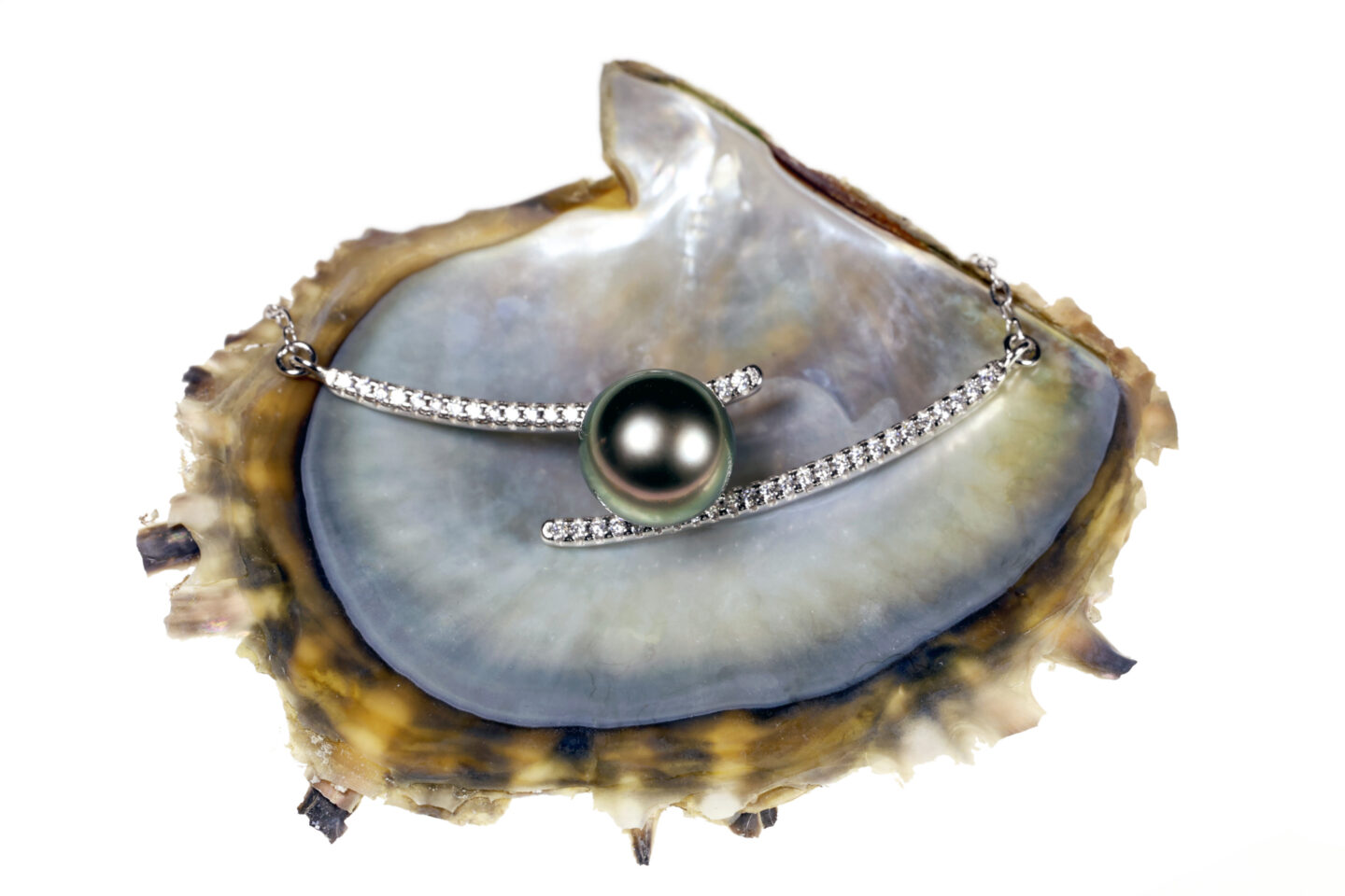 石橋さん:黒蝶貝が生み出す“生物由来”の有機質宝石材。磨いて作られる光沢というより、成長の過程で生まれた光沢をもっていて、人工的に再現するのは難しい質感です。日本の石垣島で養殖法が確立され、現在ではタヒチ産のものが世界的に知られています。ひとつとして同じ色合いのものが存在しない点も魅力のひとつです。